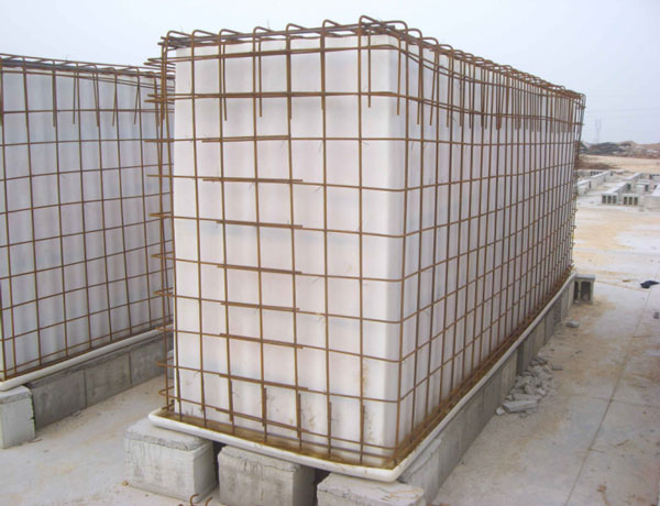 在制作PE内胆的同时准备地模,制作地模的目的是为了保证制作钢混外壳时保证电解槽上沿口的平直,同时由于地模有一定高度可使施工人员进入内部取出内模,这样内模可以循环使用。